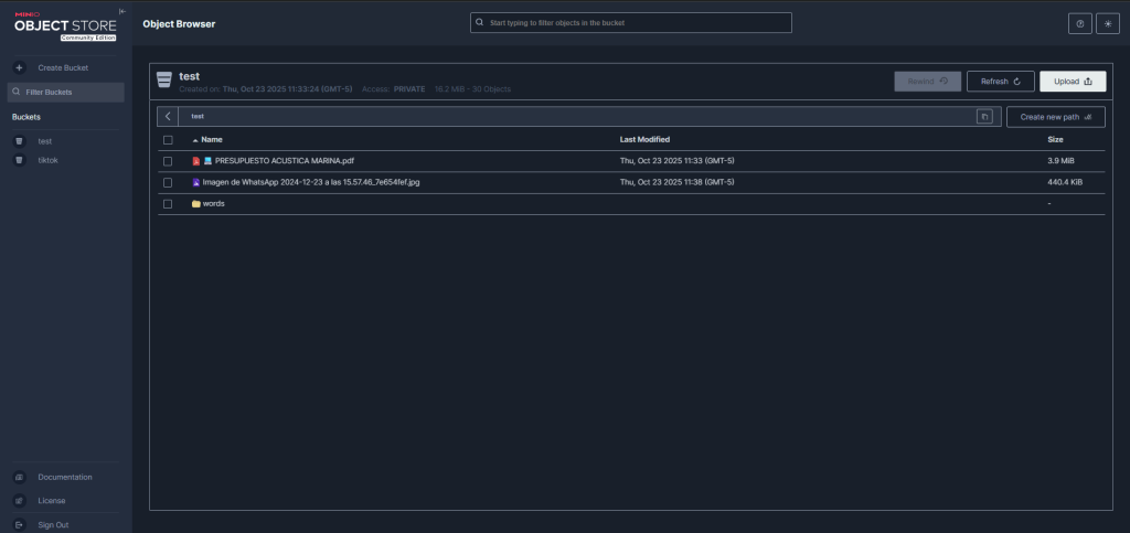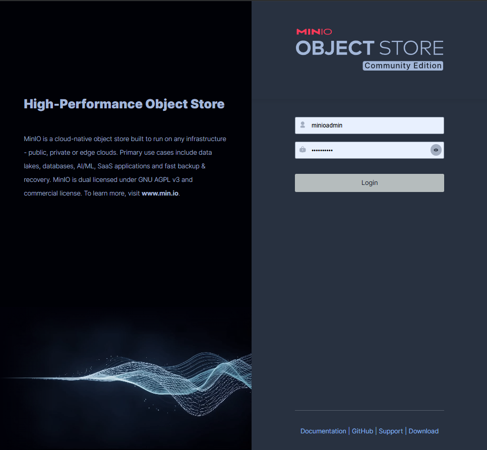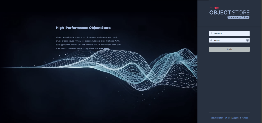 Se abrirá la consola de administración de MinIO, donde puedes iniciar sesión con el usuario y contraseña que definiste en el docker-compose.